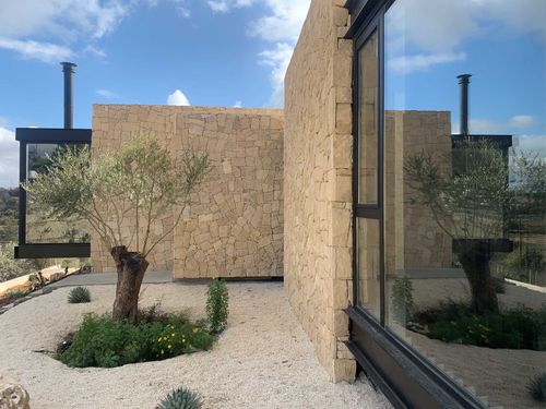 Inside, clean lines and a fluid layout define a serene environment where the living area, fireplace, and low furnishings create a space for calm reflection and connection with natural materials—stone, wood, and glass—are composed with minimalist precision, achieving an atmosphere of understated elegance.